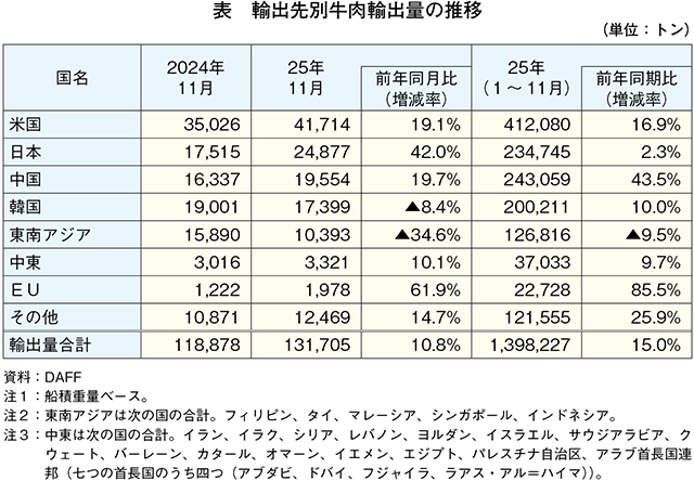 豪州農林水産省(DAFF)によると、2025年11月の牛肉輸出量は13万1705トン(前年同月比10.8%増)とかなりの程度増加し、25年の累計(1〜11月)では139万8227トン(前年同期比15.0%増)となり、1カ月を残し、通年の記録である24年の輸出量(134万トン)を超え、過去最高値を更新した(表)。