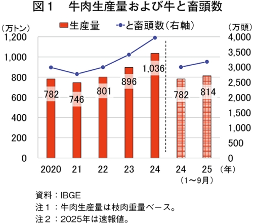 ブラジル地理統計院(IBGE)によると、2025年1〜9月の牛と畜頭数は3175万7000頭(前年同期比5.9%増)、牛肉生産量は813万6000トン(同4.0%増)といずれも前年同期をやや上回った(図1)。