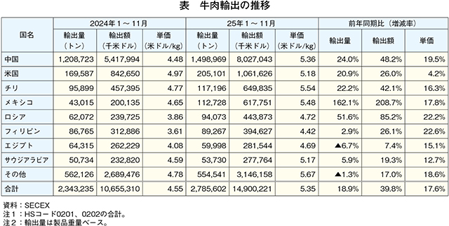 輸出先別に見ると、輸出量全体の半分以上を占める中国向けは149万8969トン(同24.0%増)となったほか、米国、チリ、メキシコおよびロシアを含めた上位5カ国が、いずれも前年同期を大幅に上回った。なお、累計では増加している米国向けであるが、単月で見ると6月以降は前年割れが続いている(図2)。そうした中、米国のトランプ大統領は25年11月14日、同年4月以降に導入した世界各国・地域に対する相互関税について、牛肉を含む特定の農産物などを対象外とする大統領令を発した(注1)。さらに、11月20日には、ブラジルに対して8月6日以降課していた40%の追加関税についても、同様の品目を対象外とする大統領令を発した。これらの措置により、今後米国向けの輸出量に影響が生じるとみられる。