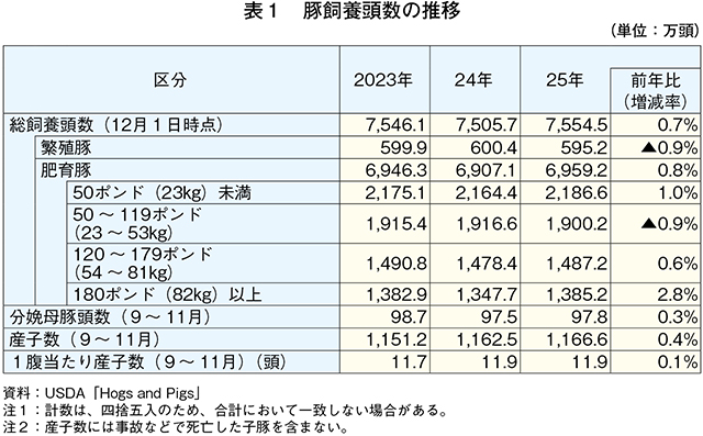 米国農務省全国農業統計局(USDA/NASS)によると、2025年12月1日時点の豚総飼養頭数は、7554万5000頭(前年比0.7%増)と前年をわずかに上回った(表1)。内訳を見ると、繁殖豚は595万2000頭(同0.9%減)とわずかに減少し、肥育豚は6959万2000頭(同0.8%増)とわずかに増加した。また、同年9〜11月期の産子数については、分娩母豚頭数が前年同期比0.3%増、1腹当たり産子数が同0.1%増となったことから、同0.4%増とわずかに増加した。