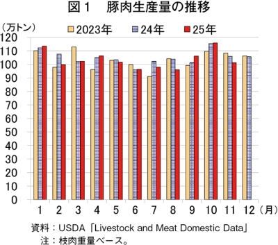 USDA/NASSによると、2025年11月の豚と畜頭数は、1025万9300頭(前年同月比5.4%減)と前年同月をやや下回った。平均枝肉重量は増加(同1.0%増)したものの、と畜頭数の減少や春の産子数が少なかったこと、主要な生産州における継続的な疾病の発生などにより、同月の豚肉生産量は101万2000トン(同4.4%減)とやや減少した(図1)。