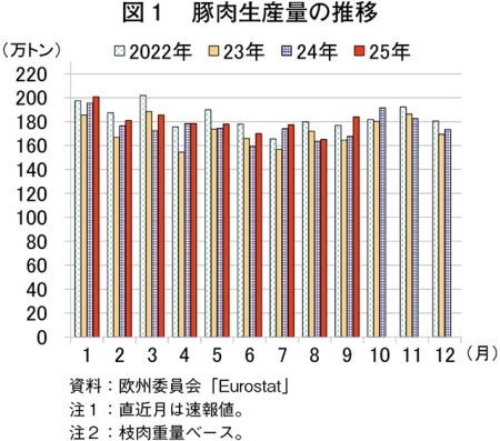欧州委員会によると、2025年9月の豚肉生産量(EU27カ国)は184万トン(前年同月比9.8%増)とかなりの程度増加した(図1)。豚と畜頭数は1948万頭(同8.4%増)と前年同月をかなりの程度上回った。また、1頭当たりの枝肉重量が94.43キログラム(同1.3%増)とわずかに増加したことも、生産量の増加につながった。