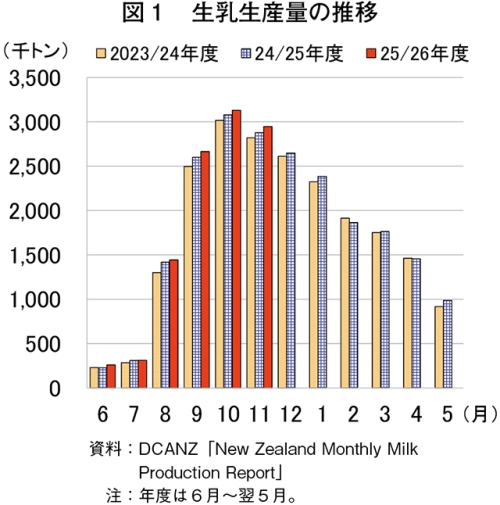 ニュージーランド乳業協会(DCANZ)によると、2025年11月の生乳生産量は294万7000トン(前年同月比2.4%増)とわずかに増加した(図1)。また、2025/26年度(6月〜翌5月)の11月までの生乳生産量も、1075万9000トン(前年同期比2.3%増)と前年同期を上回って推移している。