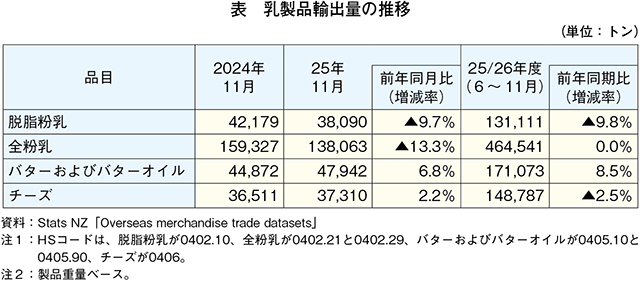 25年11月のバターおよびバターオイル、チーズの輸出量増加
