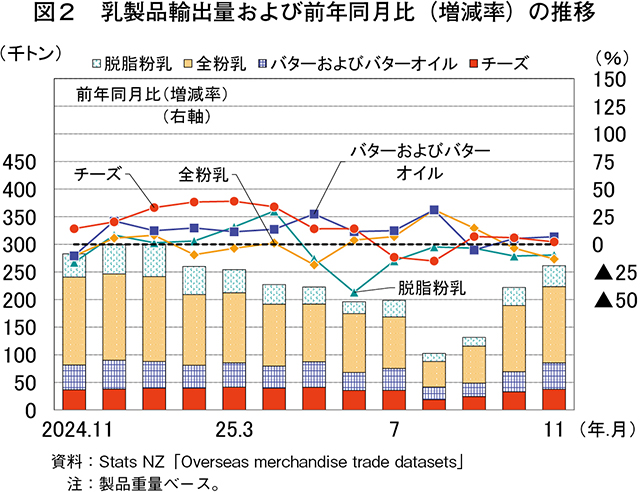 ニュージーランド統計局(Stats NZ)によると、2025年11月の主要乳製品4品目の輸出量は、品目ごとに異なる動きを見せた(表、図2)。品目別に見ると、バターおよびバターオイル、チーズは、いずれも中国向けの増加が寄与したことで、前年同月比で6.8%増、2.2%増とそれぞれ増加した。一方、脱脂粉乳、全粉乳は、いずれも中国、インドネシア向けの減少が影響し、同9.7%減、13.3%減とそれぞれ減少した。年度累計(25年6〜11月)では、全粉乳、バターおよびバターオイルがいずれも前年同期を上回った。