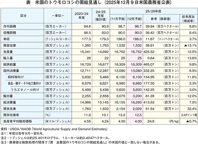 米国農務省世界農業観測ボード(USDA/WAOB)は2025年12月9日、2025/26年度(9月〜翌8月)の米国のトウモロコシ需給見通しを更新した(表)。