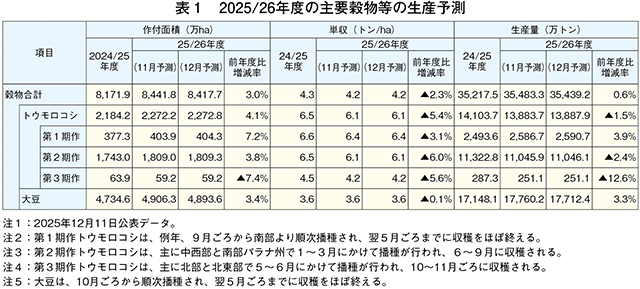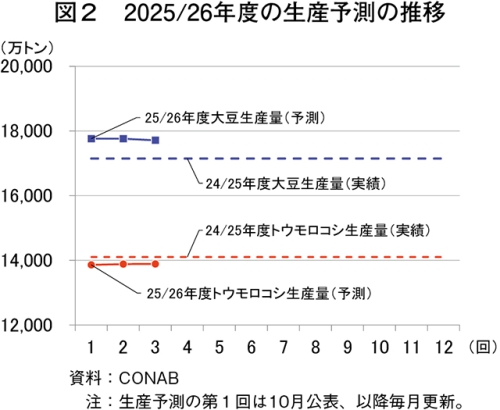 2025/26年度のトウモロコシ生産量は、前回(25年11月)より4万2000トン上方修正の1億3887万9000トン(前年度比1.5%減)と見込まれ、これは過去最大となった24/25年度に次ぐ大きさとなる(表1、図1〜2)。