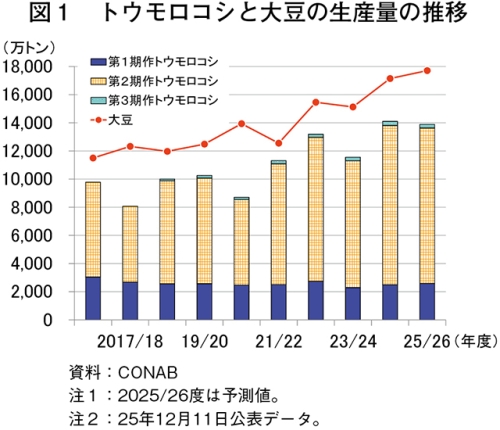 2025/26年度の大豆生産量は、前回より47万8000トン下方修正されたものの、1億7712万4000トン(前年度比3.3%増)と前年度をやや上回り、過去最大となる見込みである(表1、図1、2)。25/26年度の作付けについては、トウモロコシと同様に11月前半は一部地域で暴風雨の影響があったものの、同月後半からは天候が回復したことで、12月初旬時点では作付面積全体の90.3%と平年並みの進捗率に近づいたが、大豆の作付け時期のずれ込みが、トウモロコシの第2期作の作付けに支障を来す恐れがあるとされている。