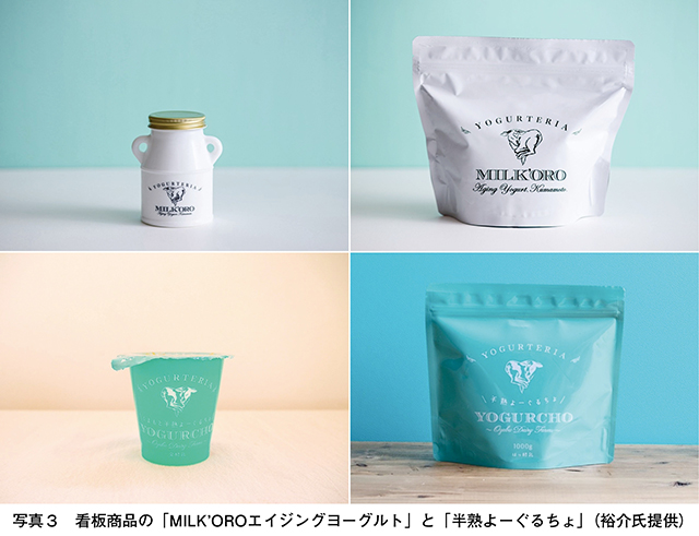 自家製造開始から3年目、前身商品をベースに改良を重ねた「半熟よーぐるちょ」に加えて、新たな看板商品「MILK’OROエイジングヨーグルト」が完成した(写真3)。ジャージー生乳とてん菜糖のみで作られ、濃厚なクリームトップと爽やかな酸味のヨーグルトが特徴のノンホモジナイズド二層式ヨーグルトである。また、「酪農家の強みは、搾った瞬間から他にはないミルクを生み出せることである」と考え、加工技術のみならず、原料乳そのものの高付加価値化にも着手した。契機は、2013年に九州地域バイオクラスター推進協議会と連携協定を結んだフランスの「ブルー・ブラン・クール(BBC)協会」との出会いである。同協会が推進する「ヘルシーファーミングプロジェクト」では、人の健康・家畜の健康・地球(土壌や環境)の健康は一体であると捉え、これに資する亜麻仁由来の飼料を推奨している。これは、畜産物の「オメガ3脂肪酸」を強化し、牛のゲップによるメタン排出量も削減できる。裕介氏は、フランス政府や国際連合にも認められたこの取り組みに共鳴し、飼料を切り替えた。さらに、海外市場の動向も敏感に捉えてA2ミルク(注3)の可能性にいち早く着目し、15年からゲノム解析による牛群選抜を開始して、約8年かけて商品化を実現した。