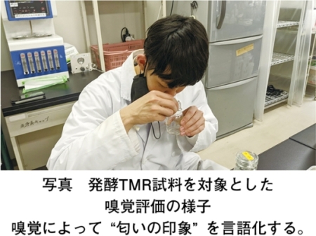 採取された発酵TMR試料の嗅覚官能評価では、“匂い強度”と“匂いの印象”を評価した(写真)。匂い強度は、試料内容を隠した容器から匂いを直接嗅いで評価した。匂い強度表示法は、0:無臭、1:やっと感知できる、2:何かわかる、3:楽に感知できる、4:強い、5:強烈という表記をした。匂いの印象は、パネルによる自由回答とした。