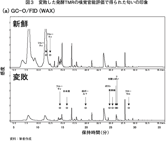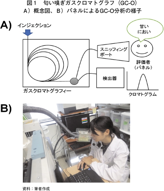 GC-O分析は、匂い嗅ぎ装置(スニッフィングポート、OP275:ジーエルサイエンス、東京)をGC-FID(GC2010Plus:島津製作所、京都)に装備したものである(以下「GC-O/FID」という)。捕集済みMonoTrapは、加熱脱着装置(ポータブルサーマルディソーバー、HandyTD TD265:ジーエルサイエンス、東京:ハンディTD)を用いて注入した。GCキャピラリカラムは、DB-5MS(長さ60メートル〈m〉、内径0.32ミリメートル〈mm〉、膜厚0.5マイクロメートル〈μm〉:Agilent J&W、CA、USA:DB5)、および異なる液相をもつInertCap Pure-WAX(長さ60m、内径0.32mm、膜厚0.5μm: ジーエルサイエンス、東京:WAX)を用いた。本研究では一つの試料を、DB-5MSを用いた分析(GC-O/FID(DB5))およびInertCap Pure-WAXカラムを用いた分析(GC-O/FID(WAX))に供試した。GC-O/FID分析前には、混合アルカン溶液(C6〜C20:ジーエルサイエンス、東京)を測定することで保持指標(Retention Index:RI)を算出した。