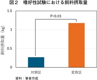 開封から一定期間を経た発酵TMRを用いて、和牛による嗜好性試験を実施した。嗜好性試験には、開封後13日間経過した発酵TMRを給与する変敗区と、試験当日の朝に開封する対照区を設けた。変敗区の発酵TMRは、開封後、ほぐしてから山積みにして好気条件で放置(1日1回攪拌)し、品温が30度以上になったことを確認してから試験に用いた。嗜好性試験は、黒毛和種育成牛4頭(平均月齢8.5カ月、平均体重238.8kg)を供試し、一対比較法で行った。一対比較法は、2種類の発酵TMRを左右別々の飼槽に同時に給与し、150分間の採食量をそれぞれ測定する方法で行った。牛が片方の飼槽の飼料を好んで摂取する可能性の影響(飼料の位置の影響)を排除するため、給与開始から30分後に左右の飼料の位置を入れ替えた。試験終了時に残飼を個別に回収し、重量を測定するとともに、給与量の差から飼料摂取量を算出した。嗜好性試験における飼料摂取量の差を分散分析により統計解析を行った。嗜好性試験に用いた発酵TMRサンプルは、嗜好性試験当日の朝に採取し、嗅覚官能評価および発酵品質等評価に用いた。