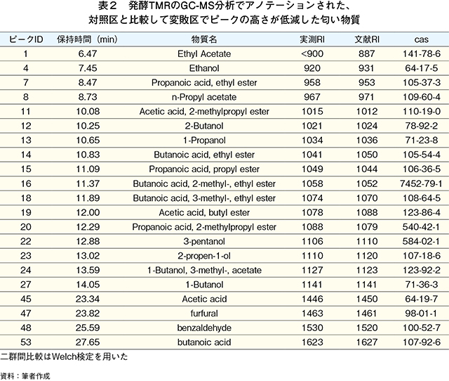 匂い物質を含む幅広いVOCsを検出するため、ガスクロマトグラフィー質量分析計(TQ8040:島津製作所、京都。以下「GC-MS」という)を用いたGC-MSノンターゲット分析に着手した。分析にはGC-Oと同じWAXカラムを、検出にはElectron Impact(EI)スキャンモード(m/z 40-250)を用いた。分析前に混合アルカン溶液(C6〜C30)を測定し、RIを算出した。捕集済みMonoTrapに内部標準物質(シクロヘキサノン:1 ナノグラム〈ng〉相当)を添加し、HandyTDを用いて注入した。物質の仮同定(アノテーション)には、匂い物質に特化したデータベースであるAromaOffice(西川計測、東京)を用いた。AromaOfficeアロマサーチを用い、マスクロマトグラムをデコンボリューションするとともに、RIデータベースおよびマススペクトルライブラリ(NIST14)を同時検索することで物質を特定した。検索結果において、ライブラリ検索の一致率が70%以上、かつRIの差異が±30以内の物質をリストアップした。仮同定物質リストは、多変量解析で利用した。