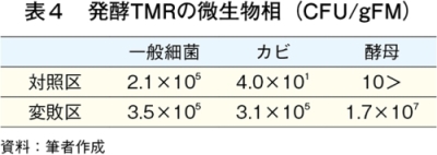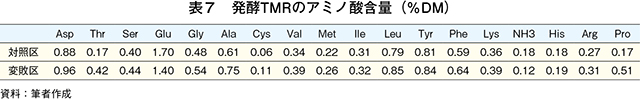 発酵TMRサンプルについて、変敗の指標として、発酵品質、飼料成分、微生物生菌数およびアミノ酸組成を測定した。発酵品質では、pH(水素イオン濃度)、揮発性塩基態窒素(VBN)/全窒素(T-N)および有機酸を測定した。pHは、ガラス電極pHメーターにより測定した。VBNは微量拡散法、T-Nは燃焼法(改良デュマ法)窒素・タンパク質測定装置(デュマサーム、ゲルハルト・ジャパン)で測定した。有機酸含量の測定は、高速液体クロマトグラフィ(HPLC)による方法で行った。飼料成分は粗脂肪(EE)、CP、粗灰分(CA)、中性デタージェント繊維(NDFom)、酸性デタージェント繊維(ADFom)および酸性デタージェントリグニン(ADL)を常法により定量した。微生物生菌数の測定は、平板培養法を用いて行った。サンプリングおよび分注したコンパクトドライ(YMおよびTC、ニッスイ)を25℃で3〜5日間培養し、一般細菌、カビおよび酵母の生菌数をカウントした。生菌数(CFU/gFM)はカウント数×希釈率を用いて行った。アミノ酸の分析では、試料を6N塩酸で110℃、24時間の酸加水分解後、高速アミノ酸分析計(L-8900、日立ハイテクノロジーズ)により測定した。