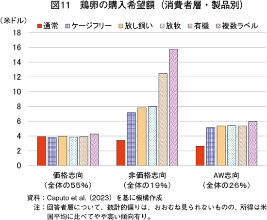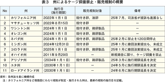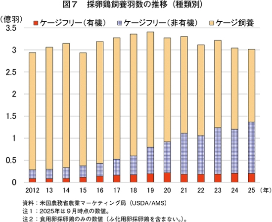 生産者にとってケージフリー化の対応は、新規鶏舎の建設や設備投資、追加の飼養管理などのコスト(費用)を要する。それにも関わらずケージフリーへの移行に踏み切ったのは、州規制や企業の移行宣言を背景に、企業との既存の供給契約を維持するためであったとみられている(注11)。
