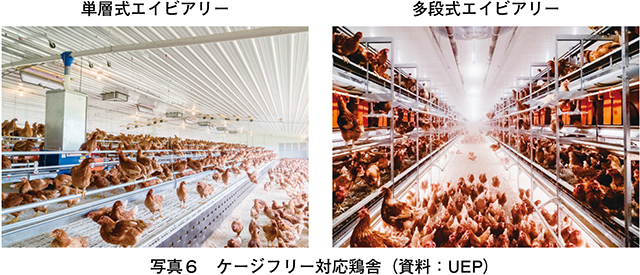 米国におけるケージフリーは、コストを抑えられる多段式エイビアリー方式が主流である(注12)(写真6)。多段式とすることで飼養羽数を確保しつつ、ケージ不使用や最小飼養面積の確保といった要件を満たすことが可能となるためである。