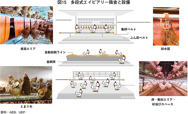 しかし、設備投資のコストは通常の2倍以上になるという。具体的には、一羽当たり50〜70米ドル(7878円〜1万1029円)と見積もられ、米国企業の飼養規模が1社当たり数十〜百万羽であることを考えると、一社で数百万〜7000万米ドル(数億〜110億円)に相当する。これは、既存のケージ鶏舎を撤去し、広い床面積やより高い換気・空調性能を備えたケージフリー仕様の鶏舎を新たに建設するだけでなく、巣箱や止まり木、鶏舎の構造に合った集卵装置やふん尿処理装置といった設備も新たに必要となるからである。(図15)。これらの投資回収には、規模にもよるが5〜10年を要するとされる。