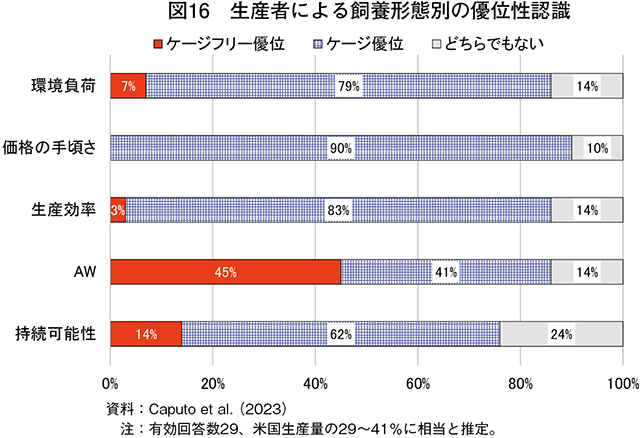生産者は、環境負荷、価格の手ごろさ、生産効率、持続可能性において、ケージ飼養がケージフリーに比べ優位と回答している(図16)。これは、飼料や水、土地、エネルギーといった資源利用において、より効率的と考えているためである。なお、企業・生産者・大学・政府研究機関・非政府組織(NGO)などの連合機関である「持続可能な卵供給連合(CSES)」も、2015年3月に同様の報告を行っている(注15)。
