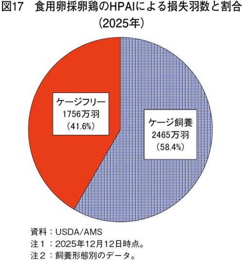 USDAによると、HPAIによる被害状況については、ケージ飼養とケージフリー飼養とで有意な差は認められていない(図17)。これは、飼養形態よりも、外部からの侵入を防ぐバイオセキュリティの水準がより影響するためと考えられている。一方で、ケージフリーでは鶏舎内での移動範囲が広く、導線の複雑化による衛生管理の難しさや、鶏同士や排せつ物との接触による汚染リスクが高まりやすいため、疾病予防にはより高度な管理が求められる。