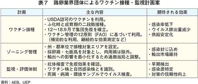 こうした中、AEBやUEPは25年4月、ワクチンについて業界独自の接種・監視計画を発表し、同年7月には政府に提出した(表7)。この計画は、1)孵化時と成育期の二段階接種による免疫維持、2)ゾーニング管理による貿易リスクの最小化、3)抗体検査での効果確認による信頼性確保―を図るというものである。