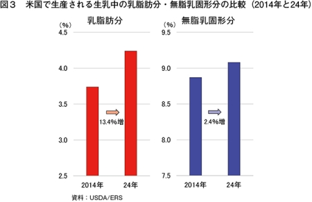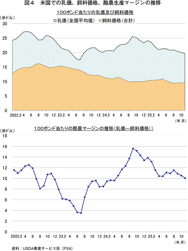 なお、乳脂肪分については、これまで米国においては、連邦政府による学校給食プログラムなどの栄養政策上避けられる傾向にあり、低脂肪・無脂肪牛乳などが多く活用されるような内容が組まれていた。一方で、25年末には学校給食プログラムにおける全乳の活用(注3)を認める法案が連邦議会で可決されたほか、26年1月に発表された米国人のための食生活指針において、食事には乳脂肪分を除去しない全乳などを取り入れることが認められた。このような施策は今後、牛乳・乳製品の需給に一定の影響を及ぼしていくと考えられる。