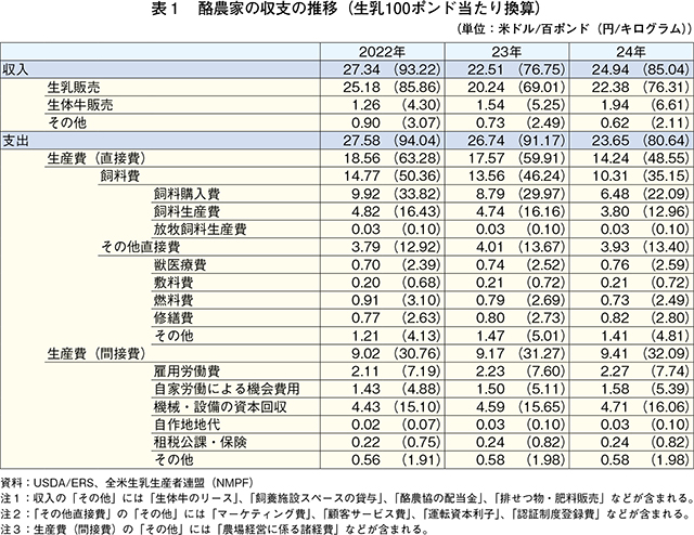 USDA/ERSによると、米国酪農生産の主要なコストについては飼料費(飼料生産費を含む)や機械・設備の資本回収、雇用労働費が大きなウェイトを占めている(表1)。それぞれの項目のうち、2022年から24年の3年間の主要コストの比較において、飼料費と燃料費は下落したものの、獣医療費や修繕費、そして、労働コストとなる雇用労働費や自家労働に対する機会費用は上昇している。収入については、生乳販売の利益は22年と24年を比較すると減少している一方で、生体牛の出荷による販売収入は増加している。