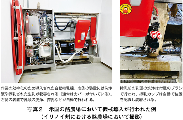 生産コストの増大に対して各農場では、主に大規模化が進められている。また、酪農業界における見解としては、1日当たりの搾乳回数増加(1日2回から3回への増加)などによる生産効率の向上も、搾乳ロボットの導入の有無にかかわらず行われているとされている。なお、大規模化のみならず、小規模な農場においては、より付加価値の高い商品の開発・販売、生体牛の販売といった収入源の多角化も図られている。生産効率の向上に向けては、カリフォルニア州のように1人当たりの雇用労働費が高額な地域においては、搾乳ロボットなどの導入も進んでいる(写真2)。