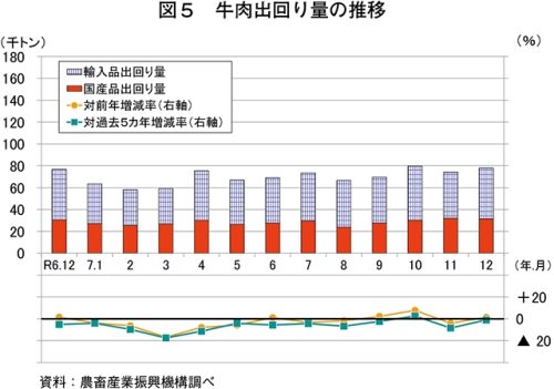 推定出回り量は、7万7945トン(同1.5%増)と前年同月をわずかに上回った(図5)。このうち、国産品は3万1491トン(同2.8%増)、輸入品は4万6453トン(同0.5%増)と、ともに前年同月をわずかに上回った。