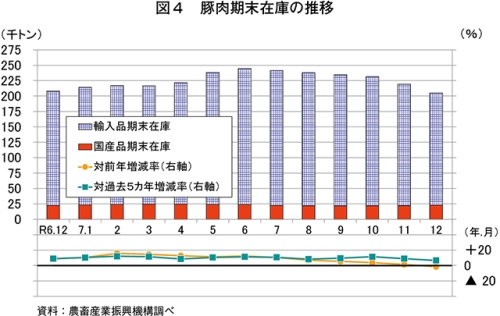 12月の推定期末在庫は、20万4996トン(前年同月比1.5%減)と前年同月をわずかに下回った(図4)。このうち、国産品は2万2928トン(同2.1%増)と前年同月をわずかに上回った一方、在庫の大半を占める輸入品は、18万2068トン(同2.0%減)と前年同月をわずかに下回った。