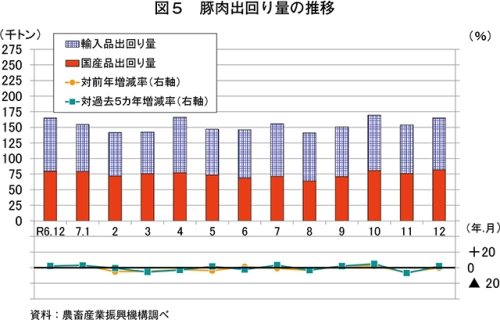 推定出回り量は、16万4943トン(同0.0%減)と前年同月並みとなった(図5)。このうち、国産品は8万1767トン(同3.0%増)と前年同月をやや上回った一方、輸入品は8万3176トン(同2.8%減)と前年同月をわずかに下回った。