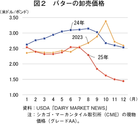 米国農務省農業マーケティング局(USDA/AMS)によると、2025年12月の1ポンド当たりの卸売価格は、バターが前年同月比43.0%安の1.44米ドル(1キログラム当たり492円:1米ドル=154.66円(注))、チーズが同23.7%安の1.37米ドル(同467円)とそれぞれ前年同月を大幅に下回った(図2、3)。バター、チーズともに堅調な生乳生産による供給過多や国内需要が軟調であることを背景に、卸売価格は下落傾向で推移している。