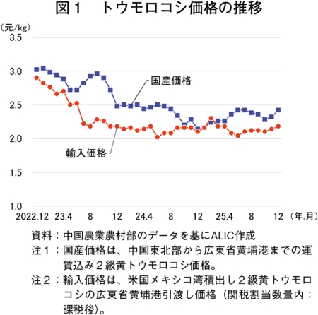 輸入トウモロコシ価格を見ると、養豚主産地の中国南部向け飼料原料集積地となる広東省黄埔港到着価格は、25年12月が1キログラム当たり2.18元(49円:1元=22.41円(注)、前月比1.9%高)とわずかに上昇した。また、同月の国産トウモロコシ価格(東北部産の同港到着価格)も同2.42元(54円、前月比4.3%高)とやや上昇したが、国産価格の上昇幅が輸入価格の上昇幅を上回ったことから、輸入と国産の価格差は拡大した。