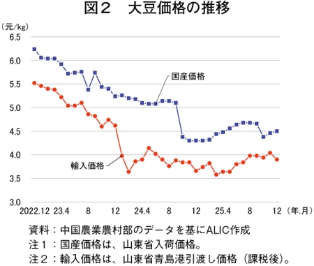各地の価格動向を見ると、主産地である黒竜江省の食用向け国産大豆平均取引価格は、25年12月が1キログラム当たり3.96元(89円、前年同月比4.3%高)と前年同月をやや上回った。また、大豆の国内指標価格の一つとなる山東省の国産大豆価格も、同4.50元(101円、同4.4%高)と前年同月をやや上回った。同月の輸入大豆価格は同3.90元(87円、前月比3.2%安)と前月からやや下落したことで、輸入と国産の価格差は拡大した。
