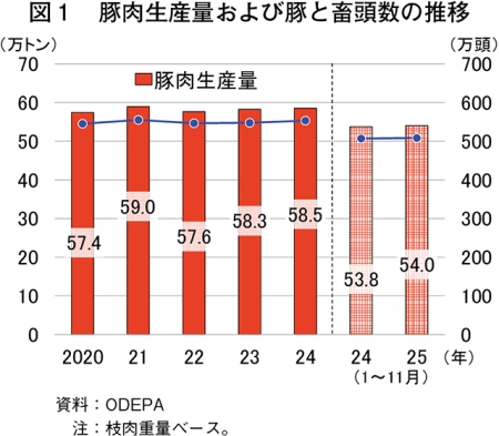 25年1〜11月の豚肉生産量は前年同期比0.5%増