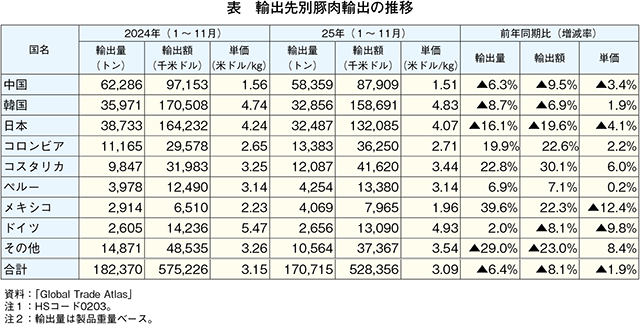 2025年1〜11月の豚肉輸出量は、17万715トン(前年同期比6.4%減)と前年同期をかなりの程度下回った(表)。輸出先別に見ると、輸出量の約3割を占める中国向けは、5万8359トン(同6.3%減)、約2割を占める韓国向けは3万2856トン(同8.7%減)、同じく約2割を占める日本向けは3万2487トン(同16.1%減)と、上位3カ国は前年同期を下回った。一方で、コロンビアやコスタリカなど、ラテンアメリカへの輸出量は前年同期を上回った。