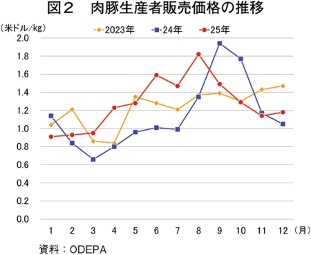 ODEPAによると、2025年12月の肉豚生産者販売価格は、1キログラム当たり1.18米ドル(182円:1米ドル=154.66円(注)、前年同月比12.4%高)と前年同月をかなり大きく上回った(図2)。