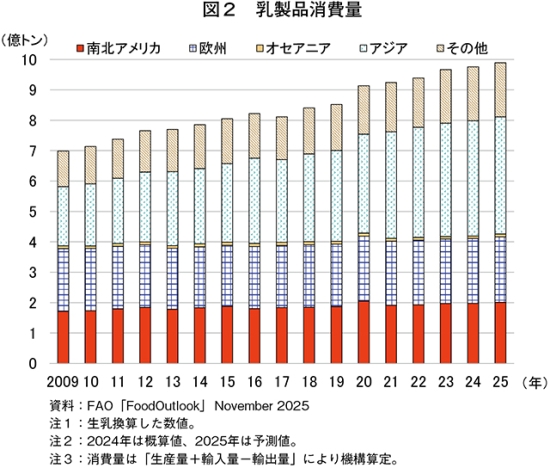 2024年の世界の生乳生産量(水牛乳を含む)は、9億7897万トン(FAO Food Outlook、2025年11月)と見込まれている。飼養環境や飼料効率の改善、育種改良による1頭当たり乳量の増加から、特にインドやパキスタンで増加しており、世界全体でも増加傾向で推移している(図1)。
