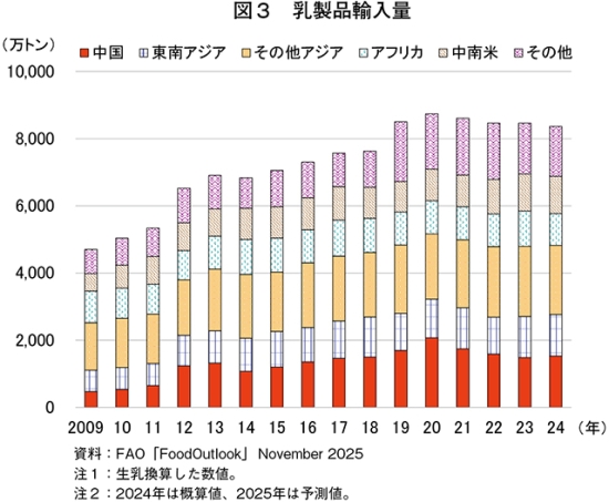 乳製品輸入量(生乳換算)をみると、2021年までは中国や東南アジア、アフリカで乳製品の消費量が生産量を上回って推移したため、輸入量も増加してきた(図3)。22年以降は、中国が国内の生乳生産を拡大したことから輸入量が減少に転じたものの、依然として世界最大の輸入国となっており、世界の乳製品輸入量も高水準で維持している。