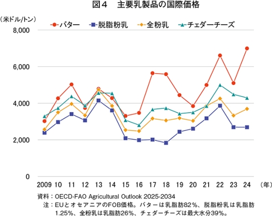 こうした中、世界の乳製品需要は増加傾向で推移していることから、近年、主要乳製品の国際価格は上昇傾向にある。中でもバターは、堅調な需要により、他の製品より上昇幅が大きい(図4)。しかしながら、25年は好調な乳価や飼料コストの低下により生乳生産量が増加したことから需給が緩和したため、乳製品の国際価格は低下に転じており、生産者乳価を下げる動きも出てきている。