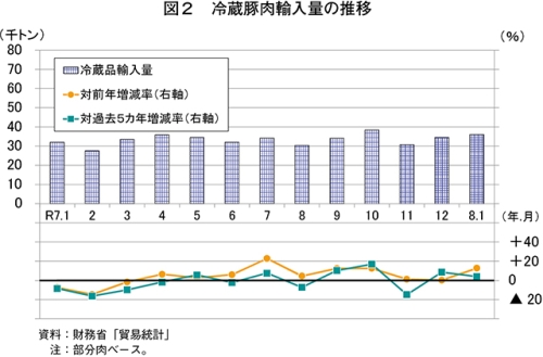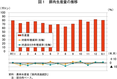 令和8年1月の豚肉生産量は、8万664トン(前年同月比0.9%増)と前年同月をわずかに上回った(図1)。