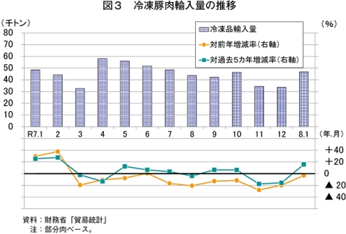 1月の輸入量について、冷蔵品は、価格や規格などで一定の評価を受けるカナダ産や、メキシコ産が増加したことなどから、3万6131トン(前年同月比12.7%増)と前年同月をかなり大きく上回った(図2)。冷凍品は、現地相場高や為替相場の影響、国内の輸入品在庫が高水準にあることにより前年同月比で減少して推移してきた中、12月はアフリカ豚熱発生によるスペイン産の輸入一時停止措置(注1)の影響も加わったことなどから前年同月を大幅に下回ったところ、1月は停止措置の対象外となったものの通関が進んだことなどから、4万6940トン(同3.1%減)と前年同月をやや下回った(図3)。この結果、輸入量の合計(注2)では、8万3073トン(同3.2%増)と前年同月をやや上回った。