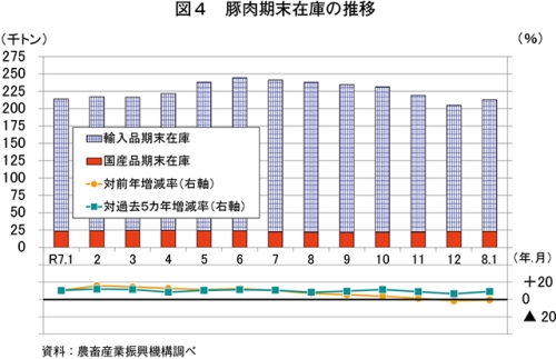 1月の推定期末在庫は、21万3087トン(前年同月比0.4%減)と前年同月をわずかに下回った(図4)。このうち、国産品は2万2910トン(同2.7%減)と前年同月をわずかに下回った一方、在庫の大半を占める輸入品は19万177トン(同0.2%減)と前年同月並みとなった。