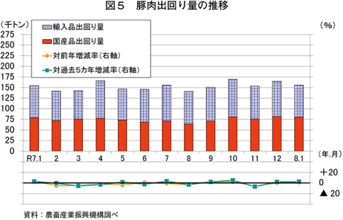 推定出回り量は、15万5531トン(同0.7%増)と前年同月をわずかに上回った(図5)。このうち、国産品は8万567トン(同2.3%増)と前年同月をわずかに上回った一方、輸入品は7万4964トン(同1.0%減)と前年同月をわずかに下回った。