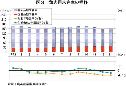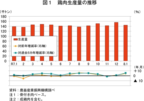 令和8年1月の鶏肉生産量は、14万4742トン(前年同月比4.4%増)と前年同月をやや上回った(図1)。