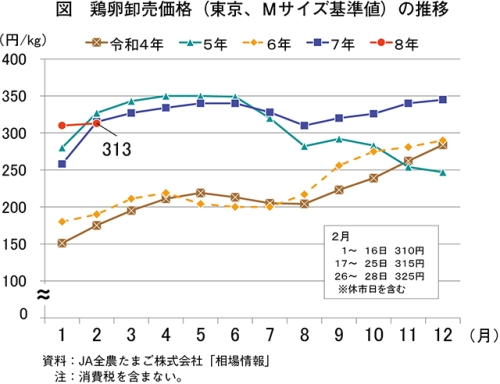 令和8年2月の鶏卵卸売価格(東京、Mサイズ基準値)は、1キログラム当たり313円(前年同月差2円安、前年同月比0.6%安)と、前年同月の同価格をわずかに下回った(図)。同価格の日ごとの推移を見ると、月初の同310円から17日には同315円、26日には同325円と計2回の上昇があり、月間の上昇幅は同15円となった。なお、過去5カ年の2月の平均卸売価格は238円であり、それと比較すると、31.5%高と大幅に上回る結果となった。