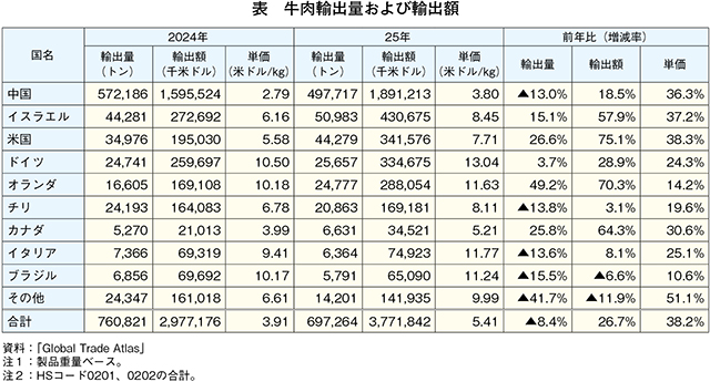 2025年の牛肉輸出量は69万7264トン(前年比8.4%減)と、前年をかなりの程度下回った(表)。