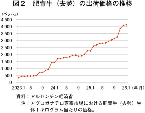 アルゼンチンの肉用牛相対取引の指標となるアグロガナデロ家畜市場の2026年1月の肥育牛(去勢)出荷価格は、1キログラム当たり4117.70ペソ(453円:1ペソ=0.11円(注)、前年同月比83.1%高)となり、前年同月と比較して約2倍の価格で推移している(図2)。現地のコンサルタントによると、近年続いていた干ばつの影響が緩和したことで肉用牛生産者による牛の保留傾向が強まっていることに加え、堅調な外需が牛肉価格を押し上げているという。また、USDAは、肥育牛の出荷価格の上昇を受け、以前作物栽培に転向した生産者の一部が肉用牛生産者として復帰しているとしている。