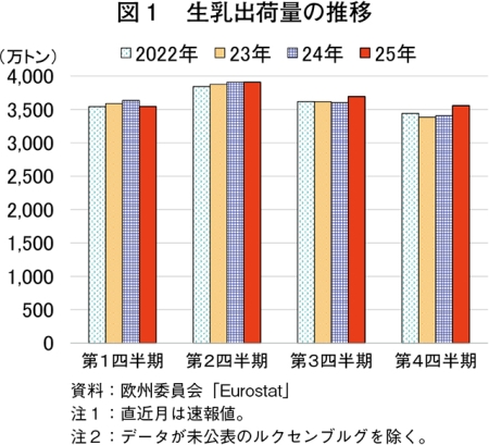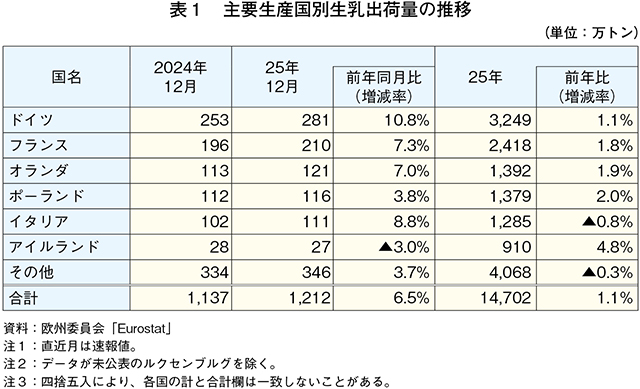 欧州委員会によると、2025年12月の生乳出荷量(EU27カ国)は前年同月比6.5%増の1212万トンと、前年同月をかなりの程度上回った。また、同年下半期(7〜12月)の生乳出荷量を見ると、前年同期比3.5%増と前年同期をやや上回った(図1、表1)。下半期の増加には、1)飼料価格の低下と良質な牧草の生育に適した気象条件、2)24年に発生したブルータングによる受胎率低下に伴う出産時期の後ろ倒し、3)安定した乳牛飼養頭数−といった要因が影響したとみられる。これらの結果、25年の生乳出荷量は前年比1.1%増と前年をわずかに上回った。