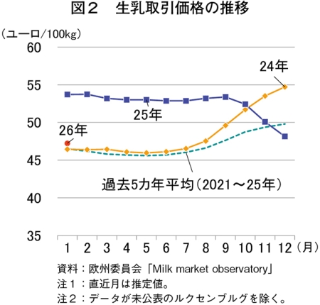 欧州委員会によると、2026年1月の生乳取引価格(EU27カ国平均)は、100キログラム当たり47.23ユーロ(1キログラム当たり88円:1ユーロ=185.32円(注)、前年同月比12.1%安)となり、3カ月連続で前年同月を下回った(図2)。現地報道では、生乳出荷量の増加が価格の下降圧力となっていると指摘されている。