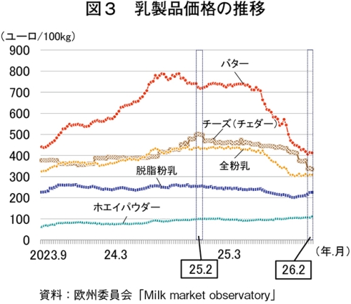 欧州委員会によると、2026年2月15日の週の乳製品価格(EU27カ国平均)は、バターが100キログラム当たり413ユーロ(1キログラム当たり765円、前年同期比42.5%安)、全粉乳が同309ユーロ(同573円、同28.6%安)、脱脂粉乳が同226ユーロ(同419円、同11.4%安)、チーズが同335ユーロ(同621円、同32.9%安)となり、いずれも前年同期を下回った。一方、前月比では全粉乳が同1.1%高、脱脂粉乳が同8.3%高と前月を上回った(図3)。